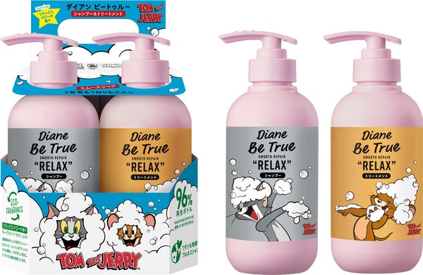 今回コラボレーションする「RELAX(リラックス)スムースリペア」のシャンプー&トリートメントセットでは、シャンプーにネコのトム、トリートメントにネズミのジェリーがチャーミングに描かれ、セットで合わせるとふたりが仲良くバスタイムを過ごしている様子が表現されています。バタバタするような忙しい毎日の中でも、トムとジェリーとともに、お風呂の中ではリラックスする時間を過ごしてみてはいかがでしょうか。