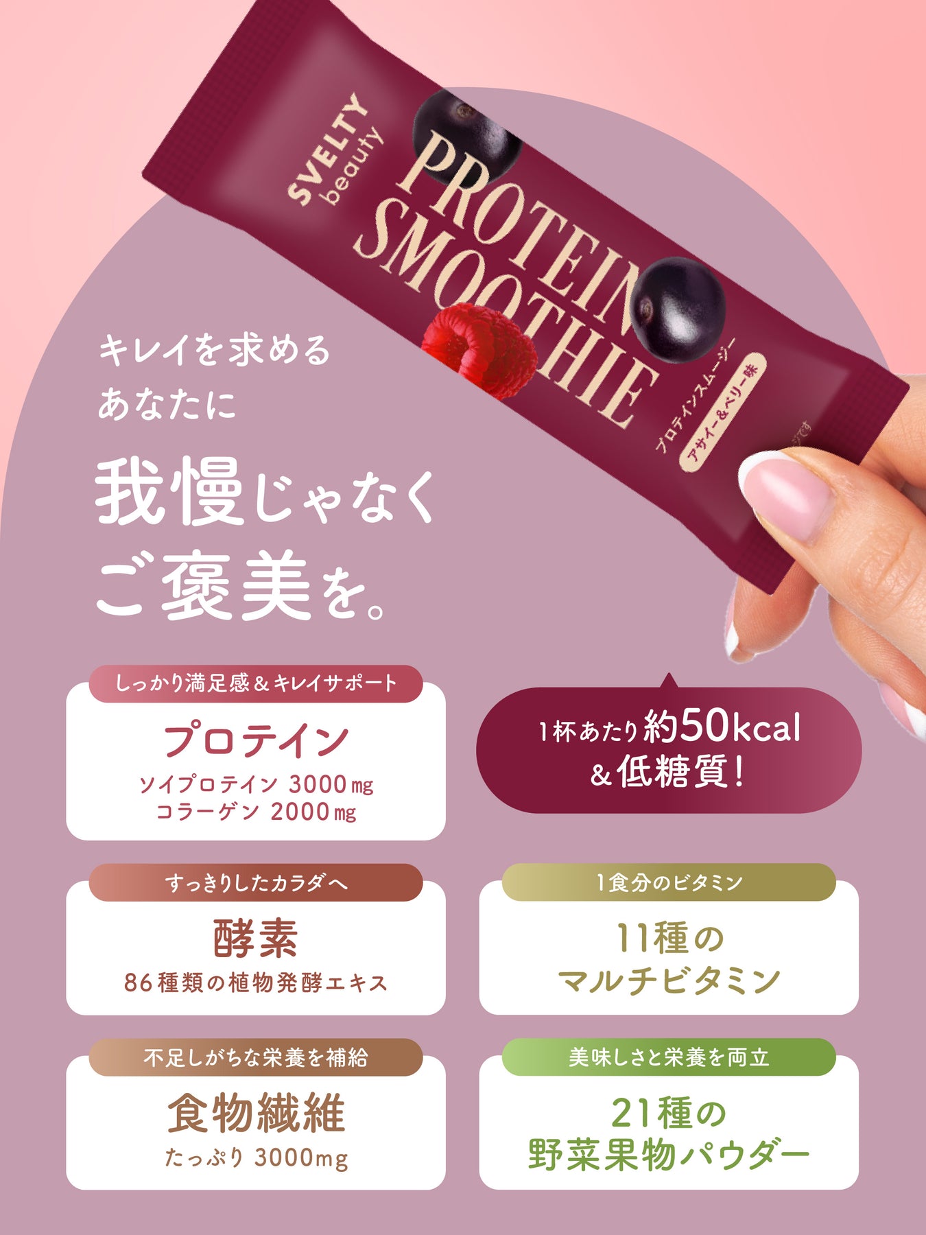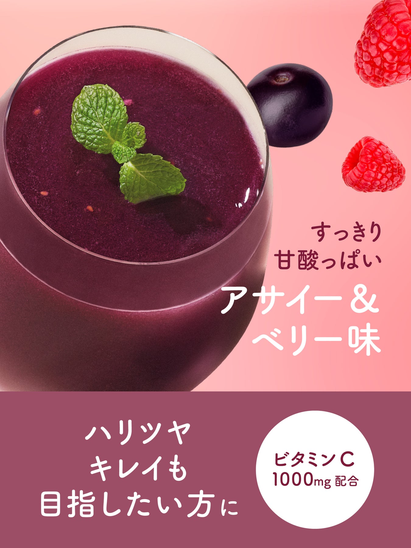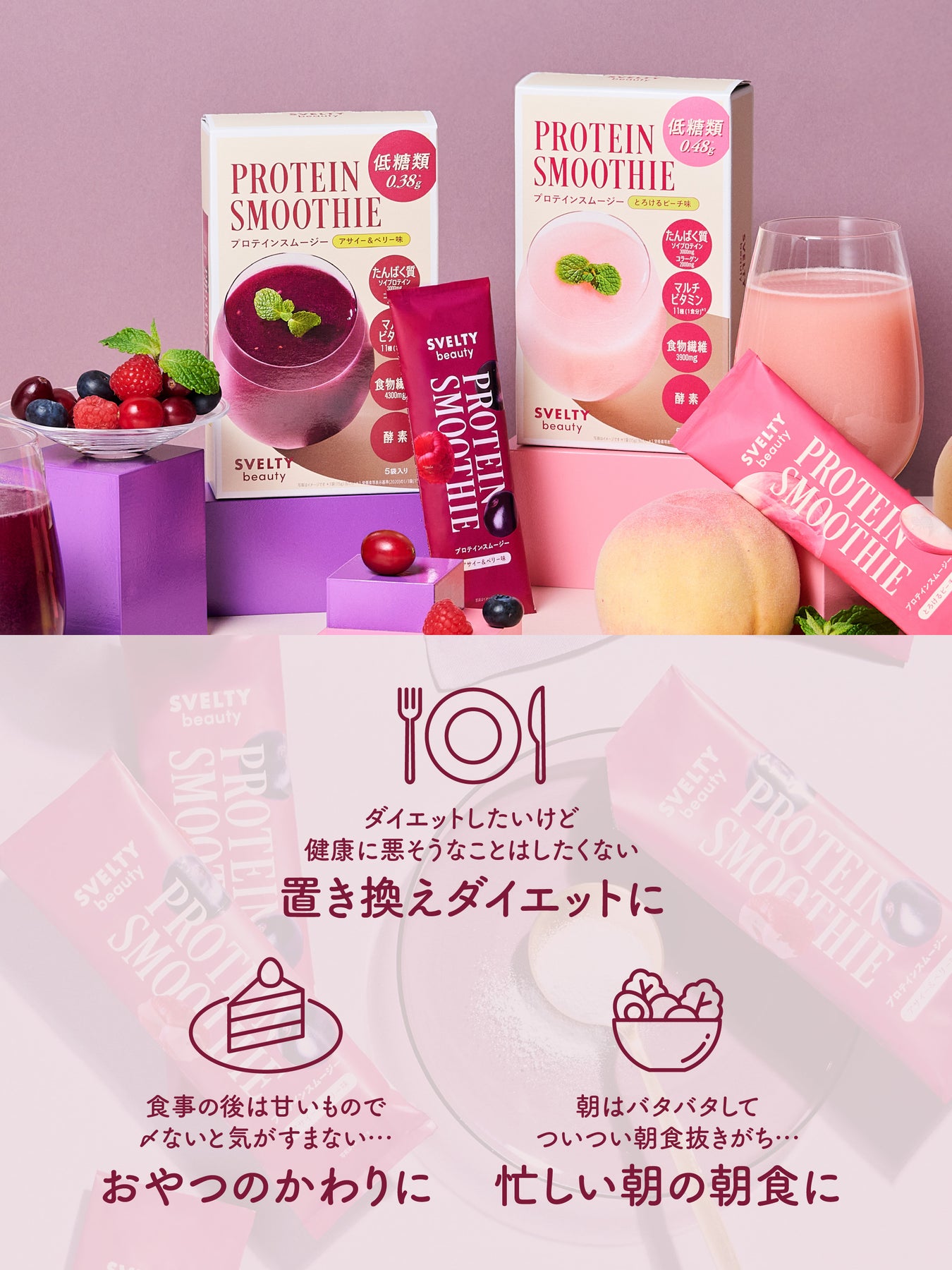 欲しい栄養一杯でまるごと。管理栄養士監修のプロテインスムージー〈美容タイプ〉。アサイー&ベリー味。
