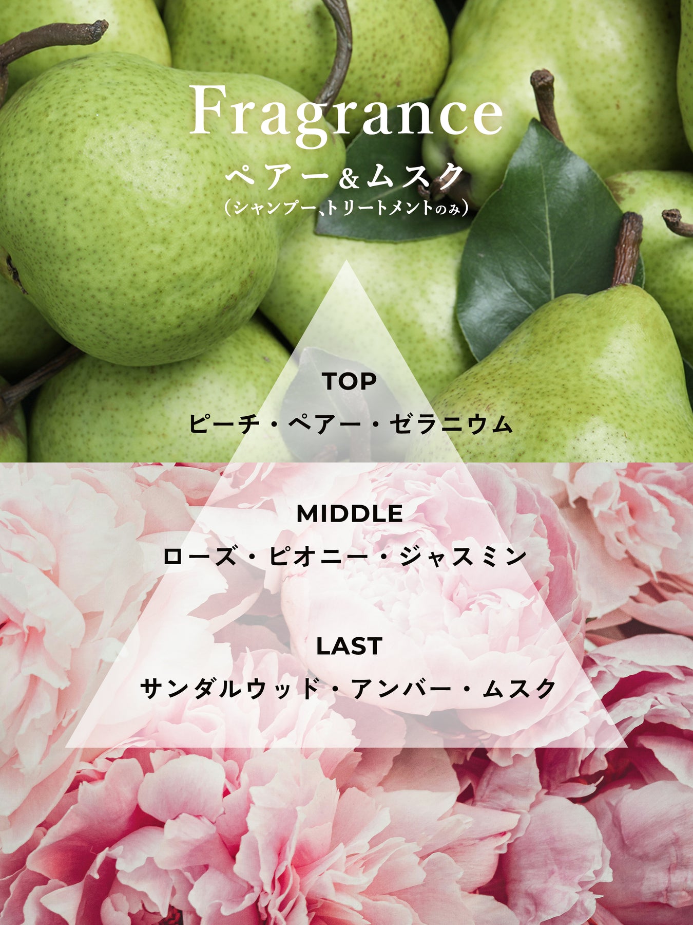 カラーの色落ちを抑えてふんわり髪へ導く、ヘマチン(*1)配合シャンプー。根元ふんわりなのに、毛先のまとまりが続きます。ペアー&ムスクの香り。