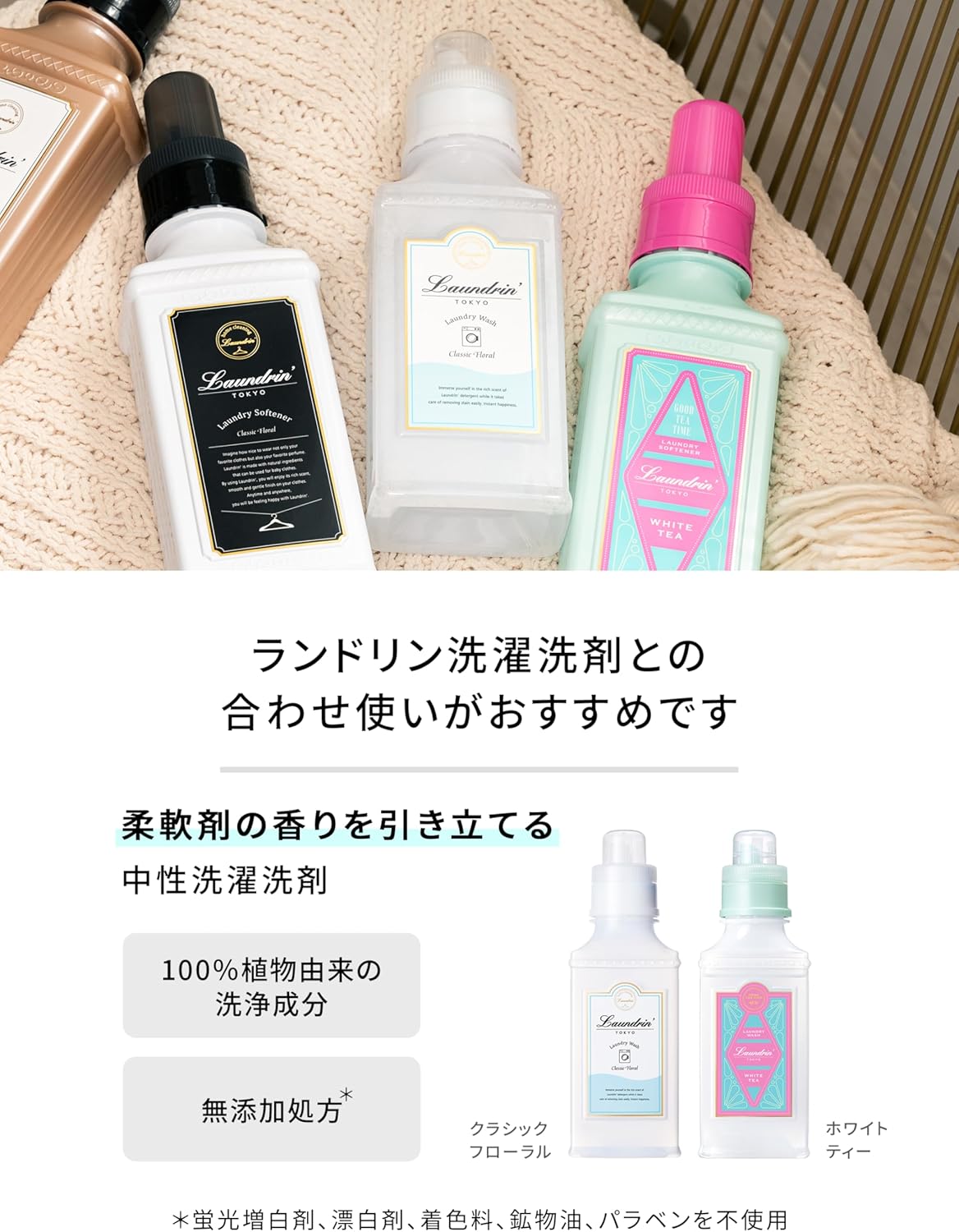 ※植物由来の柔軟成分を使用。性質上、液の分離・固化・変色が生じることがありますので、早めにお使いください