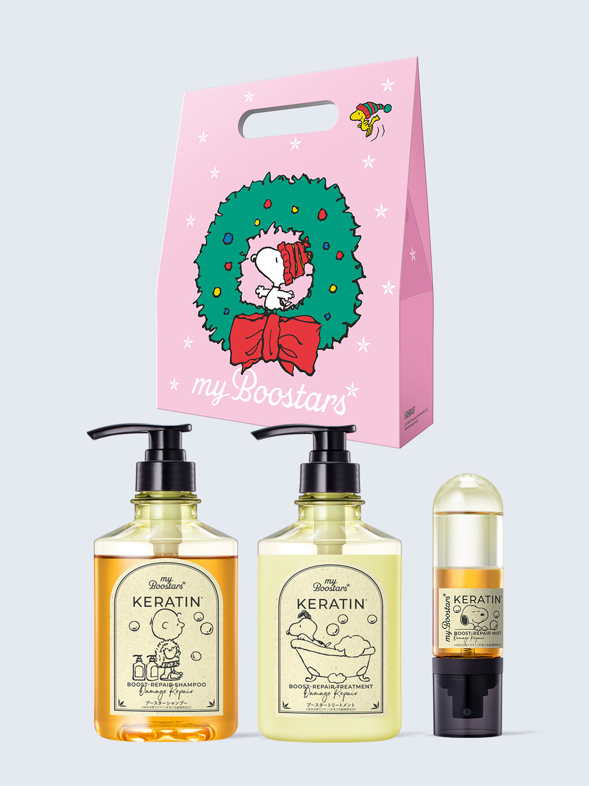 【PEANUTSコラボ:ケラチン 】PEANUTSコラボ クリスマスアートギフトボックス シャンプー&トリートメント&ブースターミスト 3点セット(マイブースターズ)