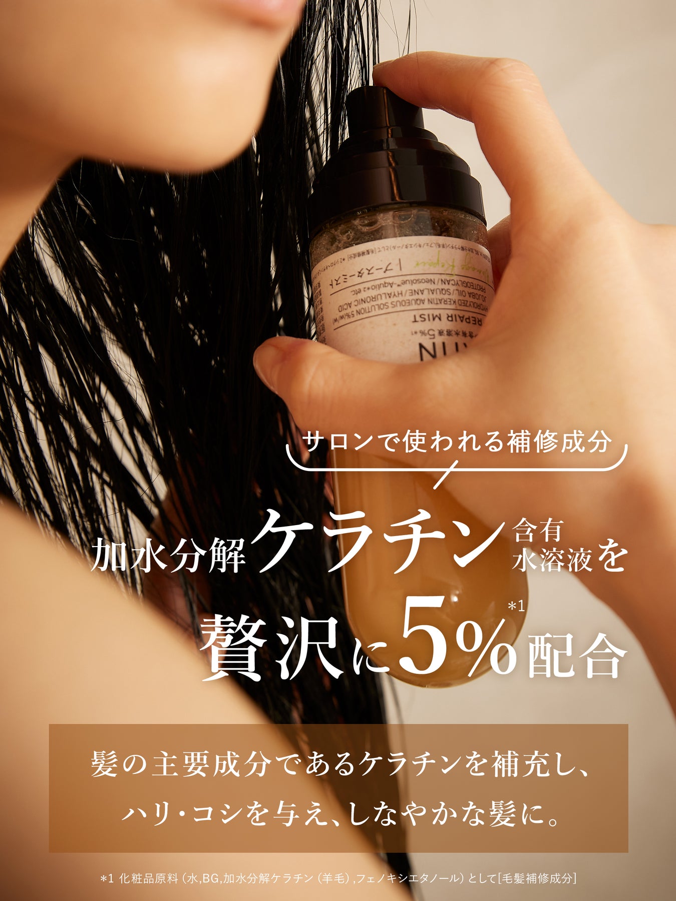 水、パルミチン酸エチルヘキシル、ジフェニルシロキシフェニルトリメチコン、加水分解ケラチン(羊毛)、加水分解ケラチン(カシミヤヤギ)、ヒドロキシプロピルトリモニウム加水分解ケラチン(羊毛)、(ジヒドロキシメチルシリルプロポキシ)ヒドロキシプロピル加水分解ケラチン(羊毛)、シクロヘキサン-1,4-ジカルボン酸ビスエトキシジグリコール、ホホバ種子油、スクワラン、ヒアルロン酸Na、水溶性プロテオグリカン、ジグルコシル没食子酸、加水分解コンキオリンタンパク、アラントイン、タウリン、リシンHCl、アラニン、ヒスチジンHCl、アルギニン、セリン、プロリン、グルタミン酸、トレオニン、バリン、ロイシン、グリシン、イソロイシン、フェニルアラニン、レモン果実エキス、ホップ花エキス、ローズマリー葉エキス、スギナエキス、セイヨウアカマツ球果エキス、イソペンチルジオール、BG、PG、DPG、クエン酸、クエン酸Na、塩化Na、カラメル、EDTA-2Na、フェノキシエタノール、安息香酸Na、香料