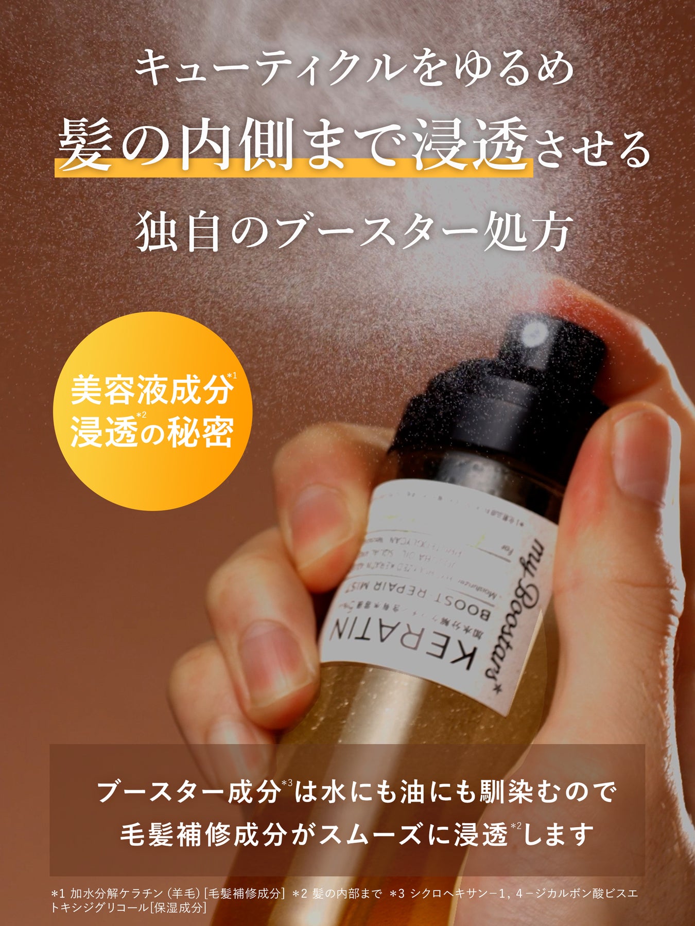 ●ケラチンブーストリペア処方 マイクロケラチン(*1):カラーやパーマでダメージを受けた髪を補修する ブースター(*3):美容液成分(*1)の髪内部への浸透(*4)を促進する