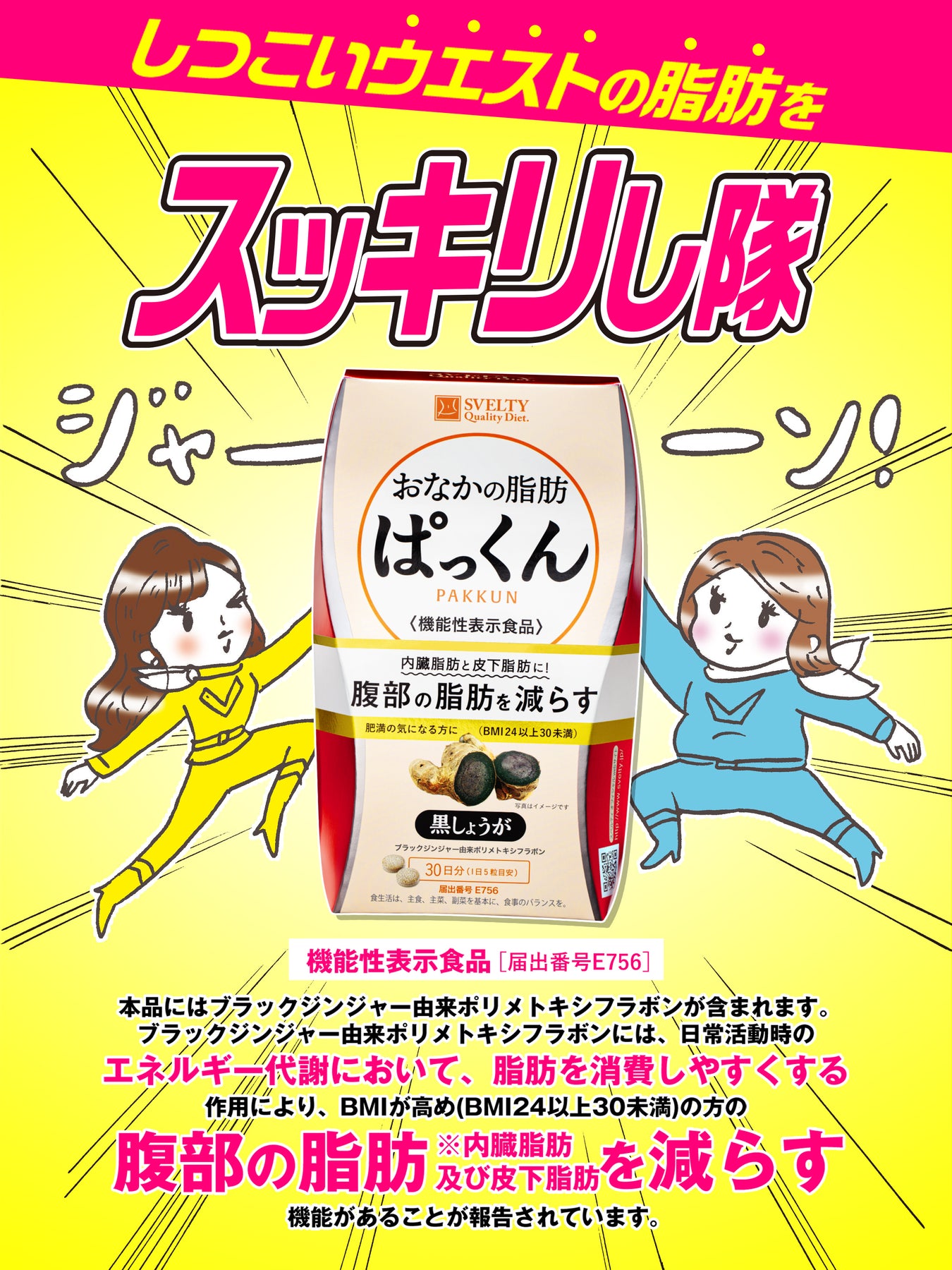[届出表示]本品にはブラックジンジャー由来ポリメトキシフラボンが含まれます。ブラックジンジャー由来ポリメトキシフラボンには、日常活動時のエネルギー代謝において、脂肪を消費しやすくする作用により、BMIが高め(BMI24以上30未満)の方の腹部の脂肪(内臓脂肪及び皮下脂肪)を減らす機能があることが報告されています。