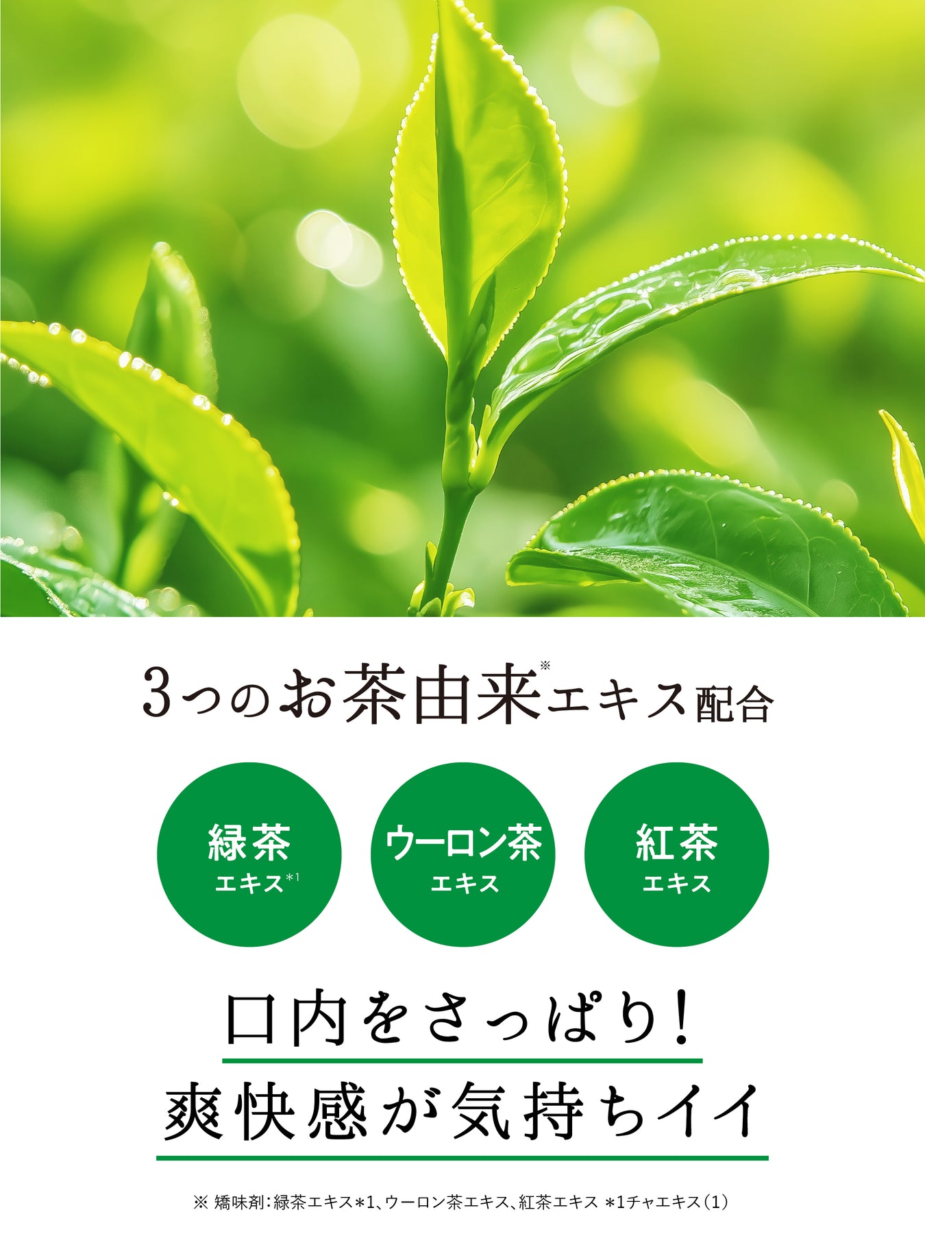 ●3つのお茶由来成分配合:矯味剤:緑茶エキス*、ウーロン茶エキス、紅茶エキス