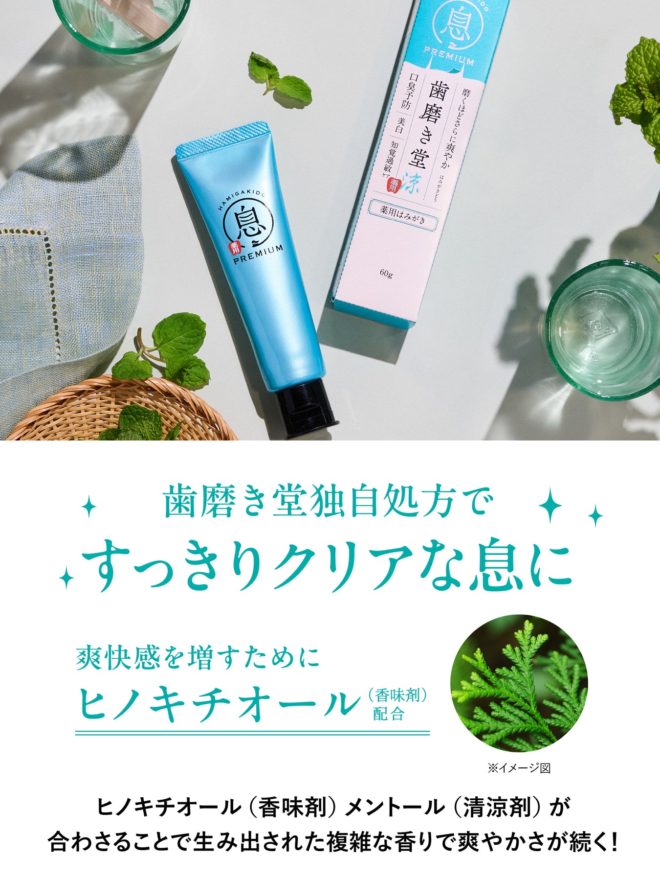 ●香味のアクセントにヒノキチオール(香味剤)配合:ヒノキチオール(香味剤)とメントール(清涼剤)が合わさることで生み出された複雑な香りで爽やか感覚続く